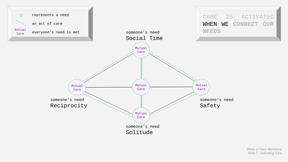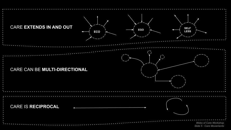 Care can be multi-directional: acts of care take many forms and travel to meet the needs of multiple people. For example, a mutual aid group of organizers meet each others’ need to solve a problem, extending in acts of care— while simultaneously receiving acts of care, from various folks, like donations, volunteering, boosting posts etc…